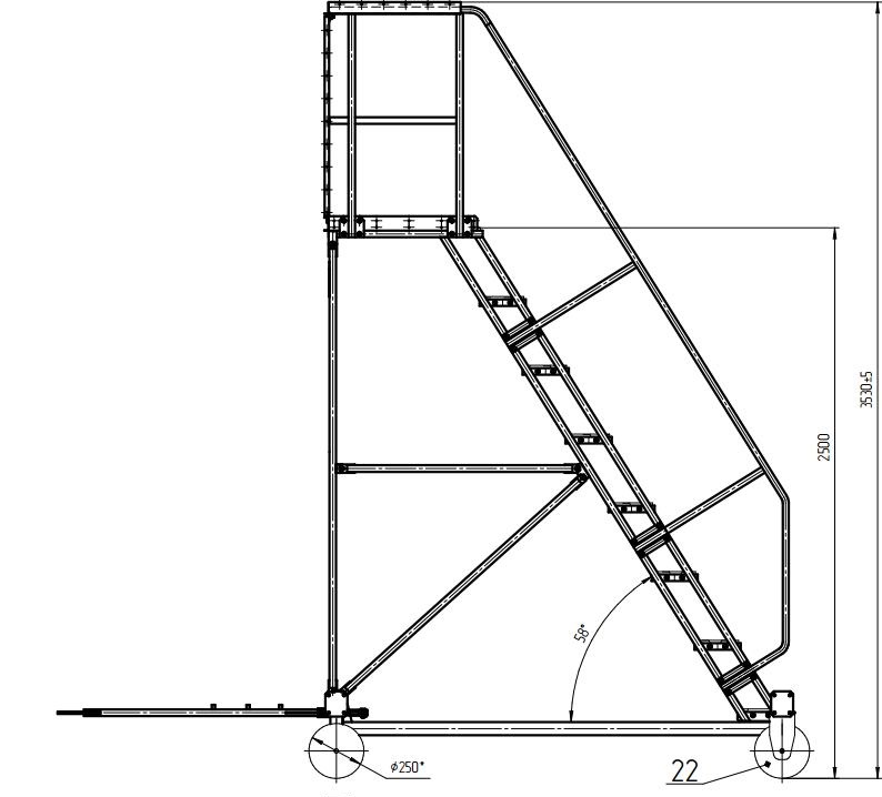 Колёсная база – 2÷4 колеса, расположенные на крайних углах рамы. Диаметр колёс 250 мм, и механизм крепления позволяет быстро и эффективно перекатывать стремянку к следующей рабочей точке.