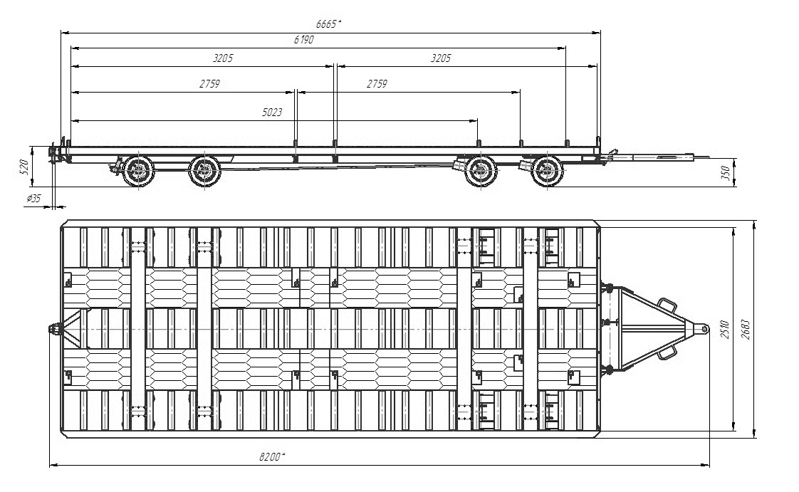 На раме установлено не менее 69 роликов в 3 ряда, диаметр – 70÷100мм. Высота от земли до уровня рабочей поверхности роликов: 510±8мм. Колеса задние – неповоротные, 8шт, спаренные; передние колеса – поворотные, 8шт, спаренные; гусматик, тип 4.00-8.